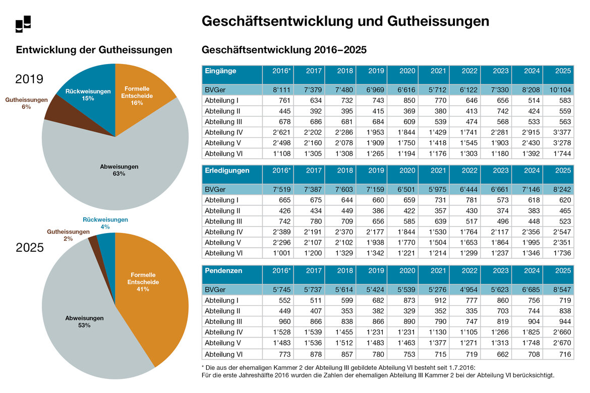 Ebenso trifft die Behauptung einer sukzessiv sinkenden Erledigungsquote nicht zu. Die aktuellen Statistiken des Gerichts zeigen vielmehr, dass die Zahl der erledigten Verfahren – insbesondere im Asylbereich – signifikant gestiegen ist. Dies ist auch eine Folge der vom Parlament 2024 bewilligten zusätzlichen fünf Richterstellen. Alle neuen Richterpersonen wurden 2025 gezielt in den Asylverfahren eingesetzt. Eine weitere zusätzliche Richterperson hat ihr Amt 2026 ebenfalls im Asylbereich angetreten. Die jüngsten Zahlen belegen, dass die verschiedenen Massnahmen wirken und zu einer deutlichen Steigerung der Erledigungen geführt haben. Die Darstellung einer kontinuierlich sinkenden Leistungsfähigkeit entbehrt daher einer sachlichen Grundlage, sowohl im Bereich des Asyls wie auch für das ganze Gericht.